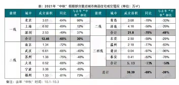 根据中指研究院统计数据,今年的中秋假期(9月19日-9月21日,下同),部分重点监测城市商品住宅成交面积较去年同期下降69%;较去年中秋假期的低基数相比,依然下降约39%。业内人士认为,中秋楼市降温主要由于近期多地房地产调控政策频出及信贷环境收紧等。