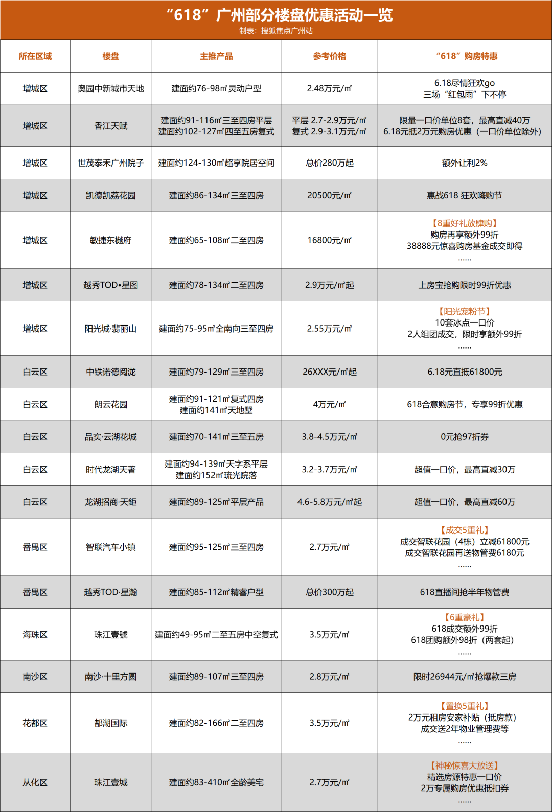 同时,各大项目还紧抓节点,借势走量,冲刺半年报。据搜狐焦点广州站观察,自“端午”假期以来,又恰逢“618”行业大促节点,一大波楼盘先后推出“直减60万”、“一口价单位”、“99折优惠”等购房特惠活动,争相抢占良机,引爆“618”。
