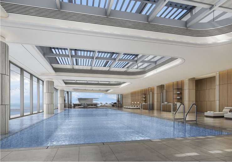 酒店拥有265间现代简洁的客房及套房,十里滨江红树林之上,保证80%的客房可享受到一线江景,酒店更突破性的结合金茂黑科技,毛细管网绿金赋能提升客房居住感受。此外,酒店更配有24小时健身中心,和约205㎡恒温泳池,搭配通透的天光设计与全景落地玻璃,收获健康之余,更将湾畔美景尽收眼底。