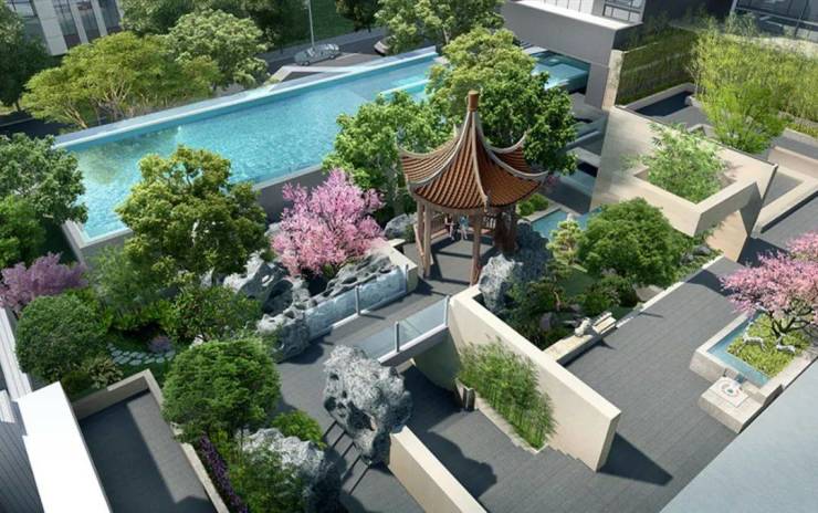 由山水比德设计院匠心设计,约4400㎡岭南风情的空中花园,将亭台楼榭、古韵游廊等园林风格融入,古香古色、移步换景,让业主在喧闹城市中感受诗意生活。
