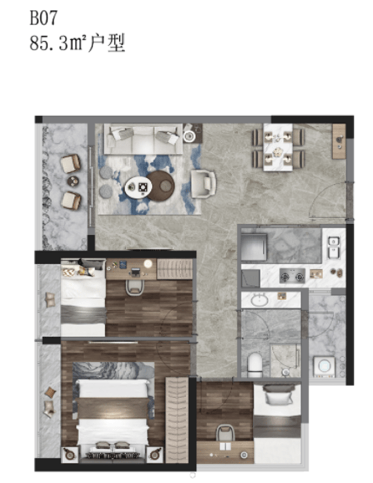 如果是年轻新婚家庭,这个“小而美”的全明三房非常适合。户型方正、动静分明,还为城中罕见90㎡以下户型双阳台设计,一处晾晒一处观景,生活与诗意各自安好;