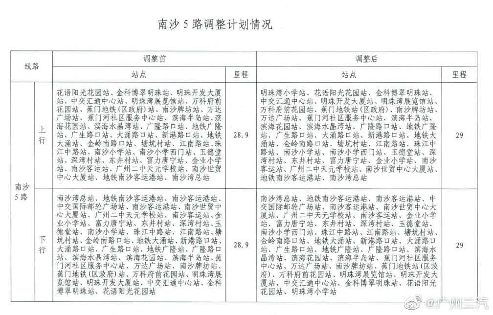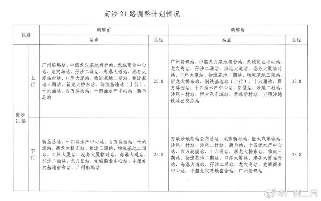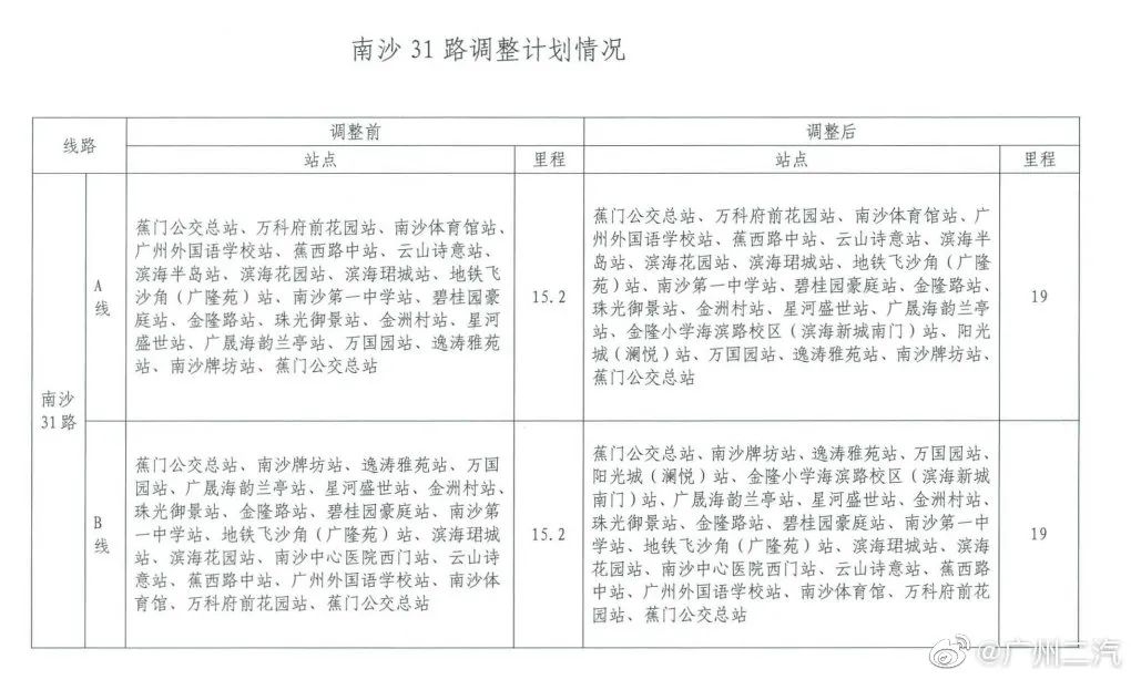 同时对南沙21路发班间隔调整为全天20分钟/班、南沙31路发班间隔调整为高峰10分钟/班、平峰20分钟/班。