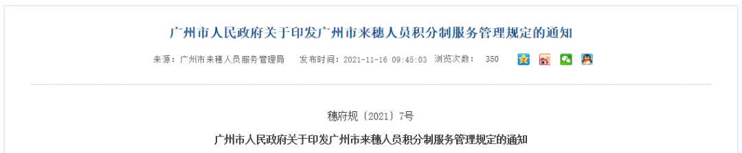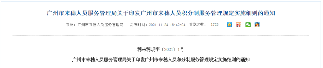 近日,广州来穗局公布了《广州市来穗人员积分制服务管理规定》《广州市来穗人员积分制服务管理规定实施细则》