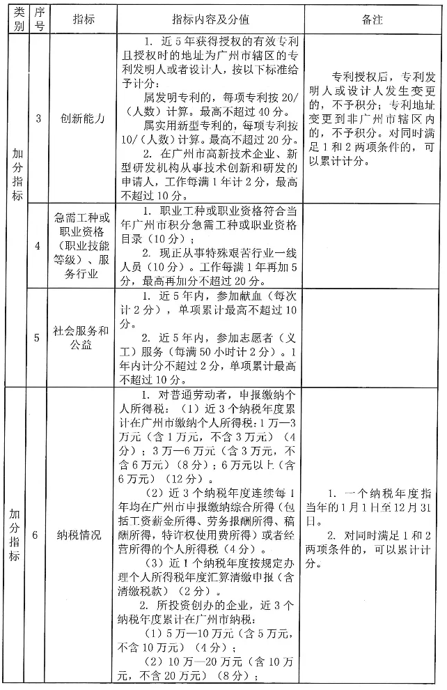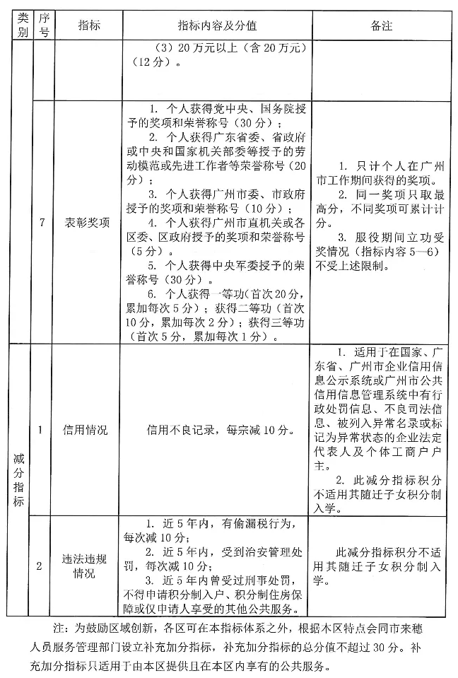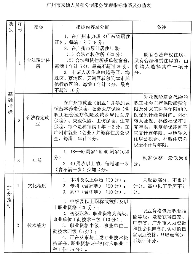 广州市来穗人员积分制服务管理指标体系及分值表: