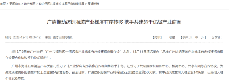 海珠区副区长现场提出按照省委省政府关于推动产业有序转移促进区域协调发展的工作部署,广清两地正在开展深度合作,将中大纺织服装商圈加工生产制造业向广清经济特别合作区转移。