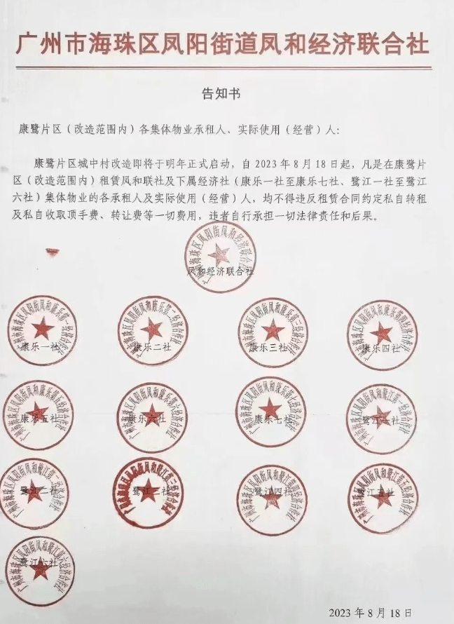 近日,海珠区凤阳街道凤和经济联合社分发了一份告知书,内容很是引人注目。康鹭片区城中村改造即将于明年(即2024年)正式启动。