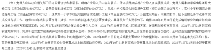 按照招商文件,项目在改造时间上有着严格的排期要求,如未能按照规定期限完成任何一项工作,将视为竞得人严重违约。具体而言,竞得人需确保2023年底前开工建设安置房,2021年12月31日前完成实施方案审批、完成补偿安置方案表决并启动补偿安置协议签约,2025年底前基本完成安置房建设。