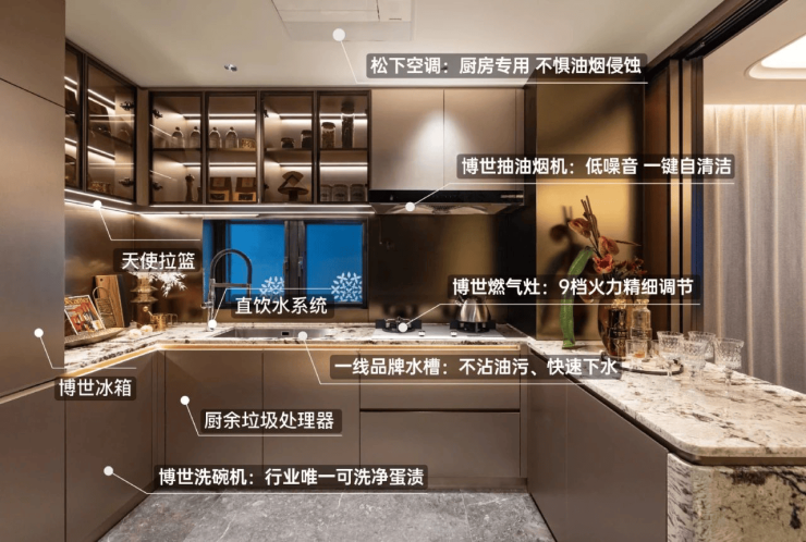 新世界·天馥整合5大智慧健康系统,精选松下、博世、东芝、高仪等12大全球顶尖品牌。从厨房的智能家电到卫生间的高端洁具,从全屋中央空调、新风系统到厨房空调、洗碗机等超配生活配套,每一处细节都经过精心挑选与搭配,为居住者提供舒适便捷的使用体验。