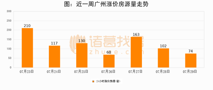 根据诸葛找房数据显示,广州24小时涨价房源量为74套,较07月28日减少28套,环比下降27.5%。与此同时,涨价房源占比小幅回落,对于购房者来说是一个入市窗口期,购房者可抓住时机入市。