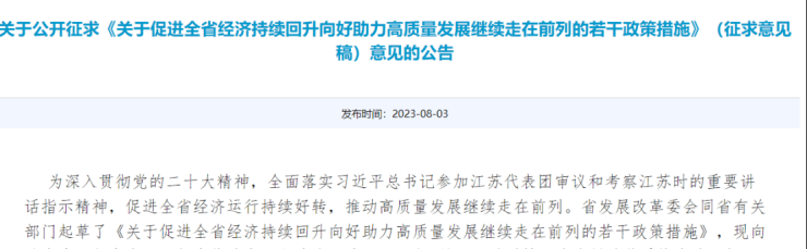 江苏省发改委近日就《关于促进全省经济持续回升向好助力高质量发展继续走在前列的若干政策措施》公开征求意见。