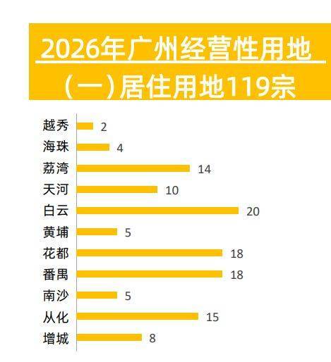 其中,居住用地119宗,占比36%,较2025年131宗同比有所减少。天河、海珠等核心区域地块数量与面积双双缩减,白云、花都、番禺等区域成为供地主力(南沙供地偏少),整体以“控增量、去库存”为导向,优质地块集中有序供应。