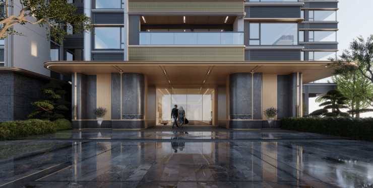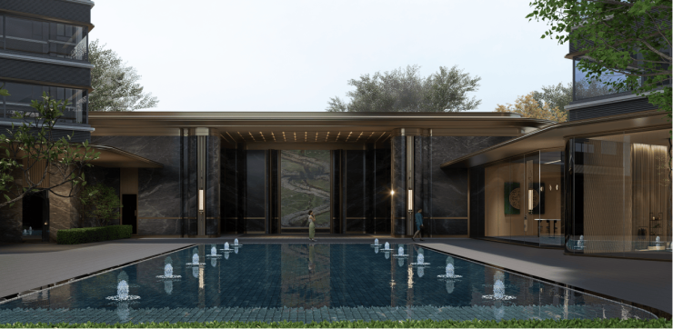 打造具品味性,长约 80 米超尺度门楼, 同时设置了宝格丽同款酒店式落客区,让回家拥有沉浸式度假酒店的体验。