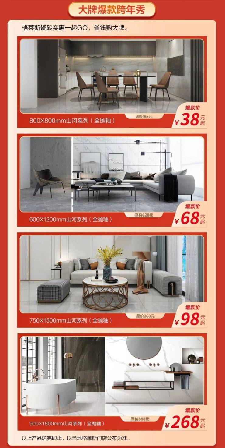 省钱购砖选大牌格莱斯瓷砖品质放心超多福利不容错过抽幸运免单迎福气新年掐点12.12!!!看过来!!! 格莱斯持续加码给大家发福利此次我们的目标只有一个新的一年好好爱自己为家换个新装我们都为你想好了星耀美好跨年…
