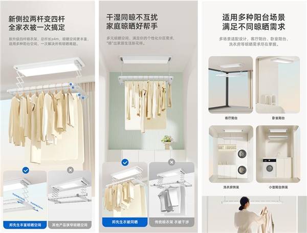 邦先生以深刻的消费者洞察能力和以人为本的科技制造理念,匠心打磨的大师级产品设计交付极具现代家居艺术美学的电动晾衣架产品,成为现代家居生活智慧感、幸福感不可或缺的一部分。未来的路程,邦先生将持续保持对高端、隐形赛道的关注和研究,不断创新出更加优质的产品和服务,为消费者带来更高标准的阳台晾晒体验。
