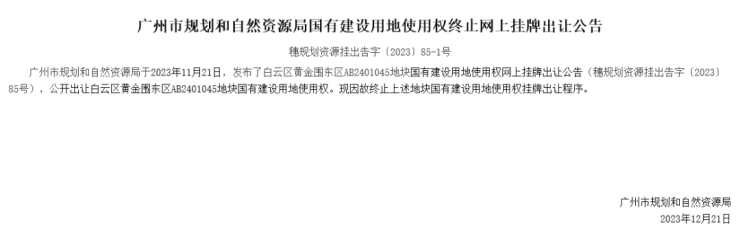 白云黄金围东区AB2401045地块则直接终止出让。