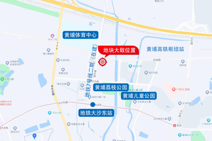地块位于护林路以南、镇东路以东,约500米处是地铁5/7号线大沙东站,另对面就是规划中的黄埔高铁站。