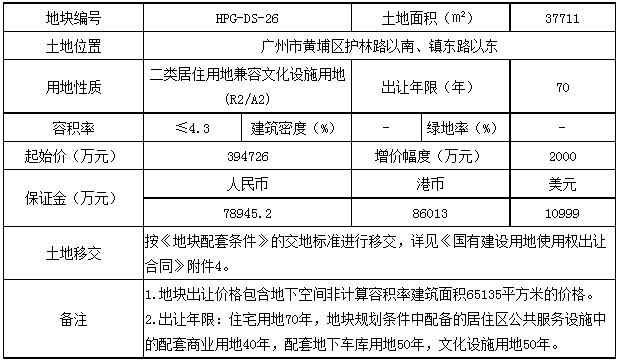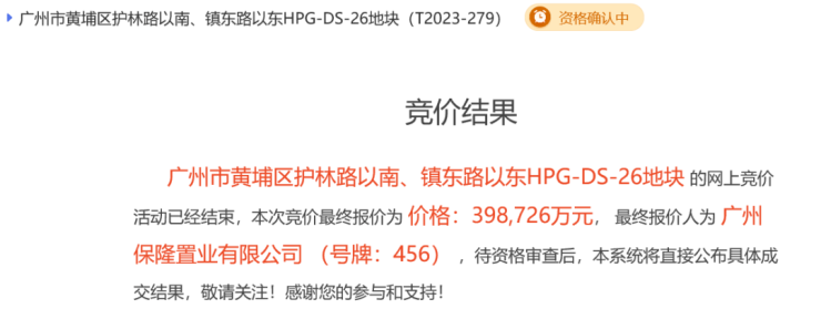 仅剩的黄埔区护林路以南、镇东路以东HPG-DS-26地块,仅经过简单3轮竞价后,以总价398726万元为广州保隆置业有限公司(即保利发展)收入囊中,折合楼面价24589元/㎡。