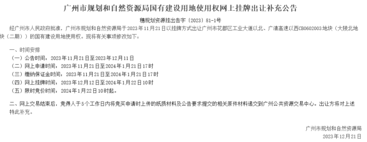 开拍前一日,花都大陵北地块(二期)宣告将延期至2024年1月22日10时起竞价出让。