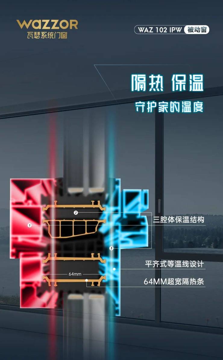 64mm超宽隔热条,是常规隔热条的2倍多,隔热效果远超同类产品。瓦瑟102IPW 被动窗,为极端气候而生,内置64mm德国泰诺风超宽隔热条,K值<0.79,被动近零能耗,构筑恒温节能的绿色建筑。