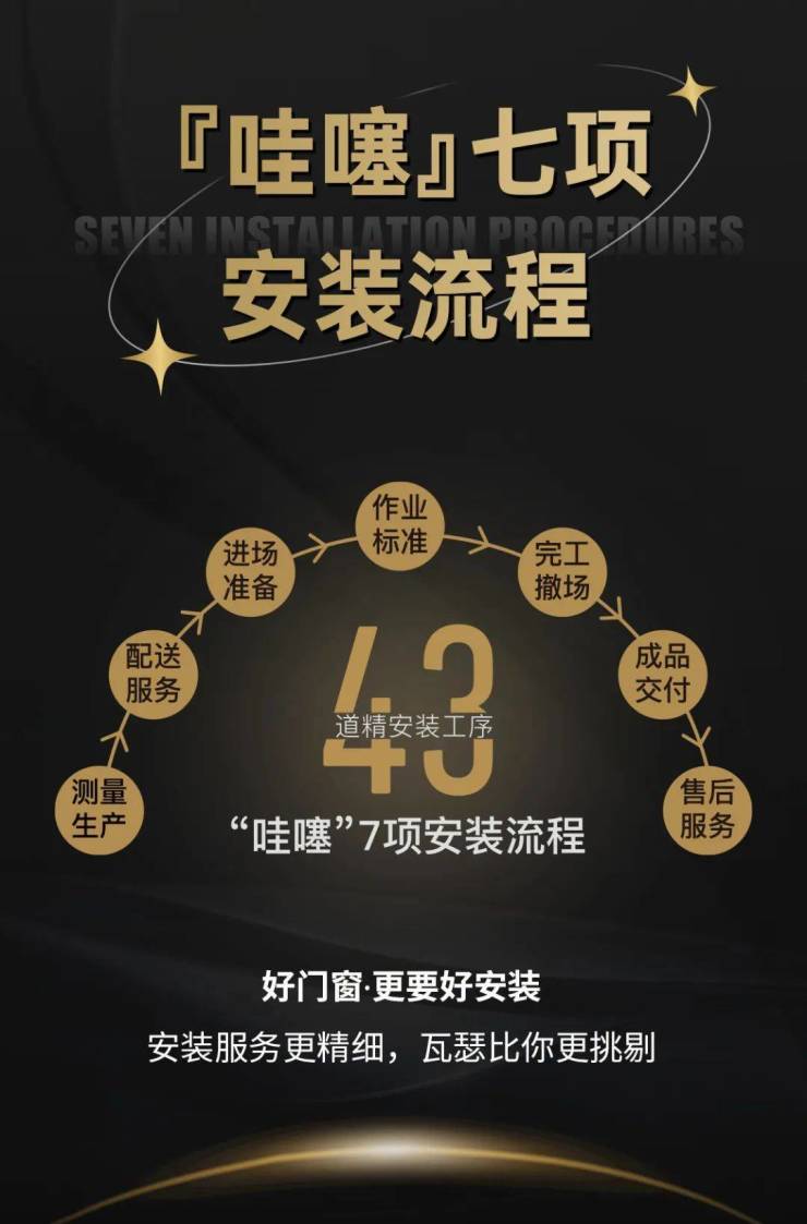 从测量到生产,从进场到完工,瓦瑟“哇噻到家”精装交付系统,43道标准化安装工序,严格把控安装交付每个环节,确保每一扇门窗完美落地,让用户放心安装,全程无忧。瓦瑟认为“交付”,不仅是产品落地的终点,更是终身服务的起点。