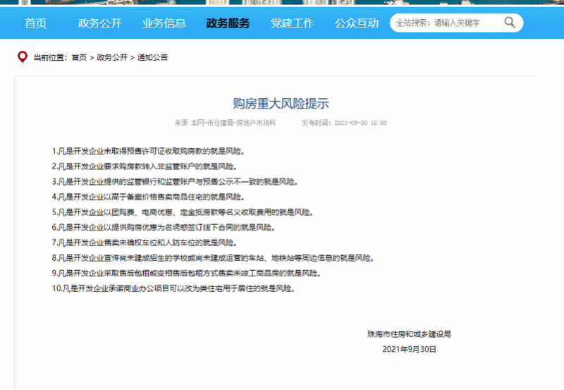 国庆假期历来都是购房的旺季,素有“金九银十”之说。不过,今年国庆节,珠海市住房和城乡建设局对外发布了《购房重大风险提示》,明确列举了十项购房中存在的现象,存在“重大风险”。十项风险中,其中多项风险,如电商费、购房款打入非监管账户、酒店式公寓等,南都珠中江新闻部已经在近期进行了专题报道和曝光,对购房者进行提醒。