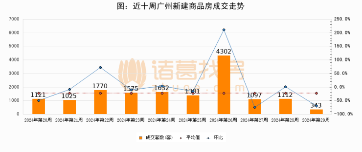 进入2024年第29周(07月15日-07月21日),广州新建商品房成交343套,较上周减少769套,环比下降69.2%