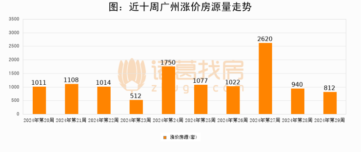 从调价房源来看,第29周广州涨价房源812套,较上周下降13.6%。与此同时,29周涨价房源占比提升0.19个百分点,业主信心持续恢复。