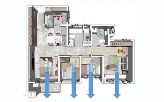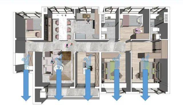 而较大面积的建面约125㎡做到了五房二厅二卫,景观阳台连通客厅和次卧,五开间朝南。