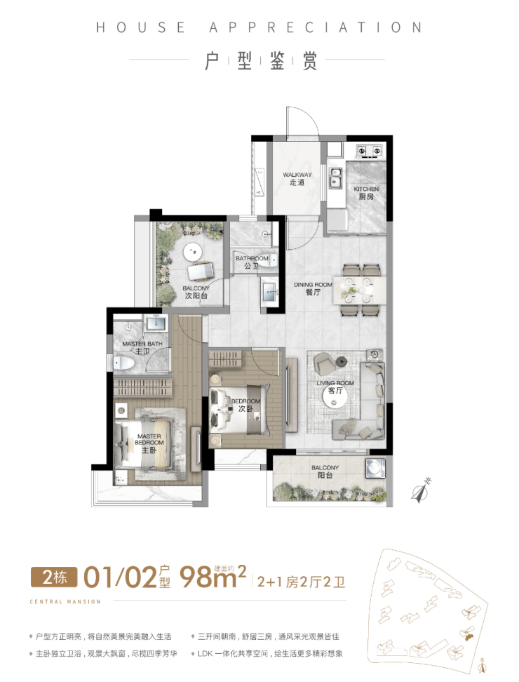 建面约98㎡3房2卫户型,LDKB一体化设计,空间连贯畅通,有效提升家庭互动氛围;