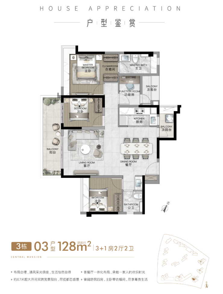 建面约128㎡3+1房2卫户型图
