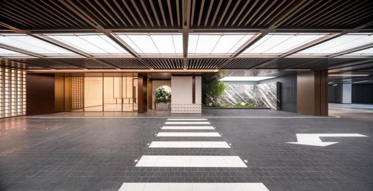 琶洲南TOD深得岭南园林意境之美。项目在坡道与停车场之间增设一道入库门庭,门庭处以清晖园为灵感,打造一处总长 21 米奢石景墙,石材纹理层叠错落,呈现出岭南人喜爱的开阔天空波浪纹理,寓意主人胸怀广阔、迎接四方宾朋。而作为清代读书人私家花园,余荫山房的静谧氛围也被引入地下车库,打造由圆润石头、细腻砂石及墨雪冰雕石组成的景墙,再配以灯光之下的松柏绿植,整体安详沉静又不失灵动,让业主在回家路上尽享松弛与宁静。除此之外,可园的灵秀、梁园的西洋范也在项目一一呈现。