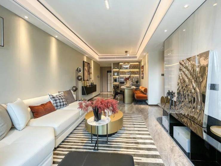 餐客厅连成一体,将过道空间纳入,提高空间使用率。再连接南向的大阳台,采光面和观景面直望园林和空中泳池,让人眼前一亮。