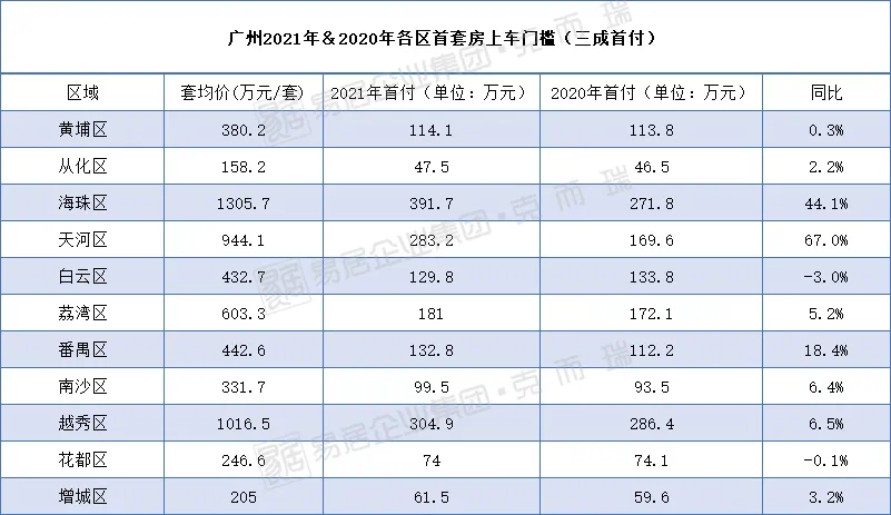 其中天河上车门槛上升幅度较大,达67%。此外,全市上车门槛较高的是海珠,三成首付约391.7万。