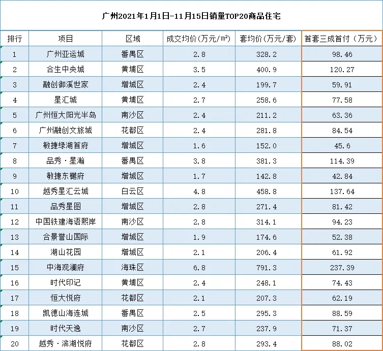 附广州2021年1月1日至11月15日销量TOP20商品住宅及其三成首付上车门槛