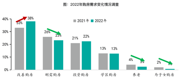 调查显示,计划于2023年购房的占比仅占40%,其中购房意愿较2022年更强占比达到50%,他们认为2023年市场或将逐步恢复,短期低迷行情将逐步减弱,或将成为短期置业最佳时期。调查显示,2023年改善购房需求占比达到40%,位居各类需求首位,而刚需需求占比仅占24%,呈现下滑趋势。