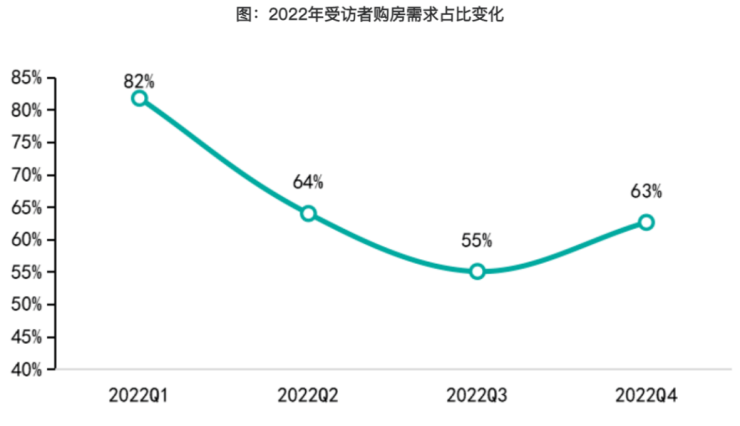 购房需求出现底部回升迹象。据调查显示,2022年前三季度受访者购房需求呈现逐步下滑趋势,2022年第三季度购房需求降至谷底,占比约为55%;而四季度购房需求呈现底部回升,占比约为63%,主要是受疫情放松、中央及地方重磅救市政策提振带动,但与历史数据相比,整体购房需求仍处于相对低位水平。