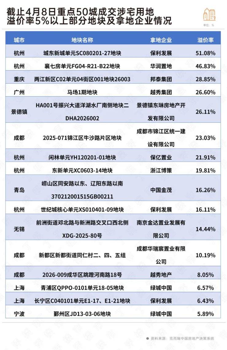 截至4月8日的数据显示,重点50个城市共成交了280幅涉宅用地,其中溢价成交的地块共有25幅,占比不到10%,溢价率高于5%的地块只有18宗,这些热点地块集中在一线城市核心地段及强二线城市优质板块。其中,长三角城市占了一半以上,仅杭州就有5幅,另外成都也有3幅地块高溢价成交。