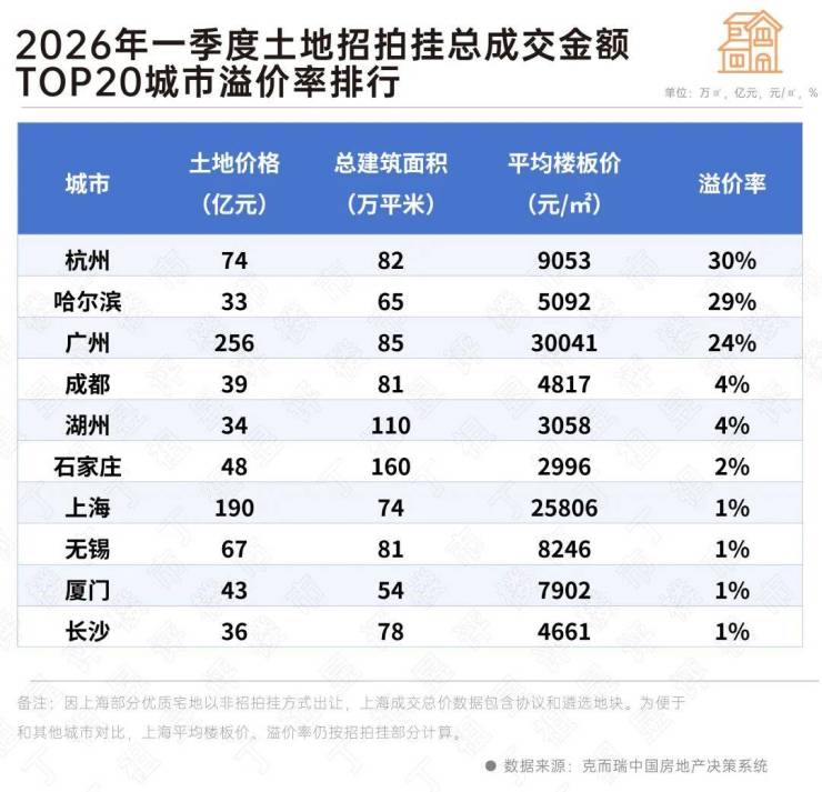 从一季度土地成交金额TOP20城市表现来看,杭州、广州、哈尔滨三城表现突出,平均溢价率均突破20%,成为土拍热度的“领头羊”。