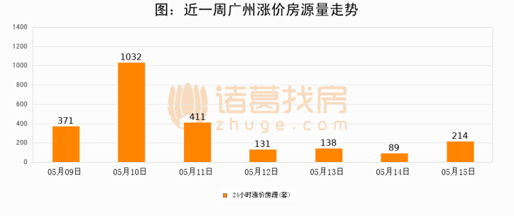 根据诸葛找房数据显示,广州24小时涨价房源量为214套,较05月14日增加125套,环比上涨140.4%。与此同时,涨价房源占比小幅扩大,业主信心有所提升。