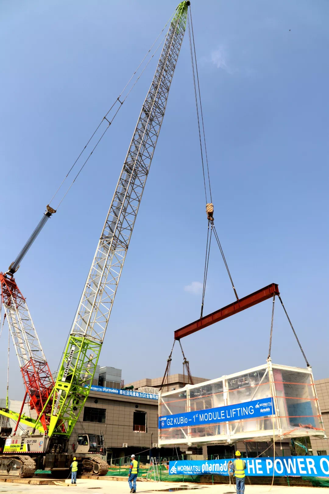 11月18日上午,首批共6个KUBio模块于知识城GE生物科技园内的GE-龙沙生物制药项目现场顺利完成吊装。黄埔有关职能部门以及GE公司、龙沙集团(Lonza)、广州高新区集团等相关单位负责人出席了安装启动仪式。