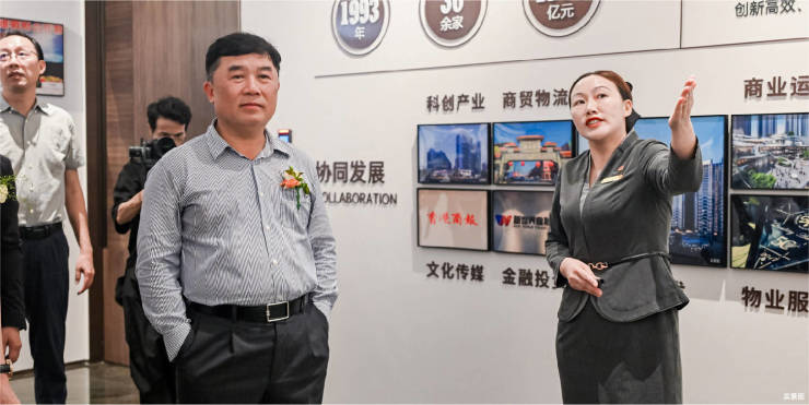 营销中心内部,领导和来宾们驻足于品牌文化墙前,在专业顾问娓娓讲述中,共同追溯品牌的发展历程与核心价值;随后,众人移步至影音体验区,沉浸于《四季山水美学片》意境之中,感受匠心筑就的美好未来。