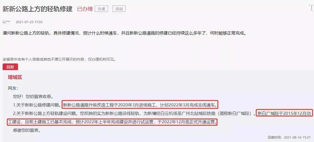 而2021年8月16日的留言板同样回复称:预计2022年上半年完成建设并进行试运营,于2022年12月底正式开通运营。