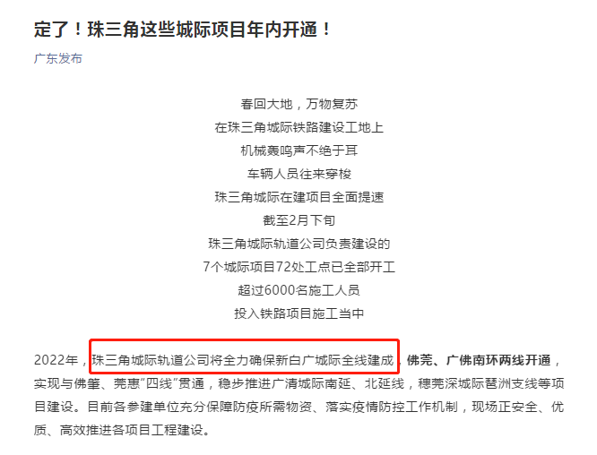 2022年,珠三角城际轨道公司将全力确保新白广城际全线建成,佛莞、广佛南环两线开通,实现与佛肇、莞惠“四线”贯通,稳步推进广清城际南延、北延线,穗莞深城际琶洲支线等项目建设。