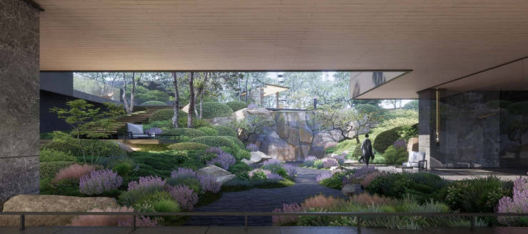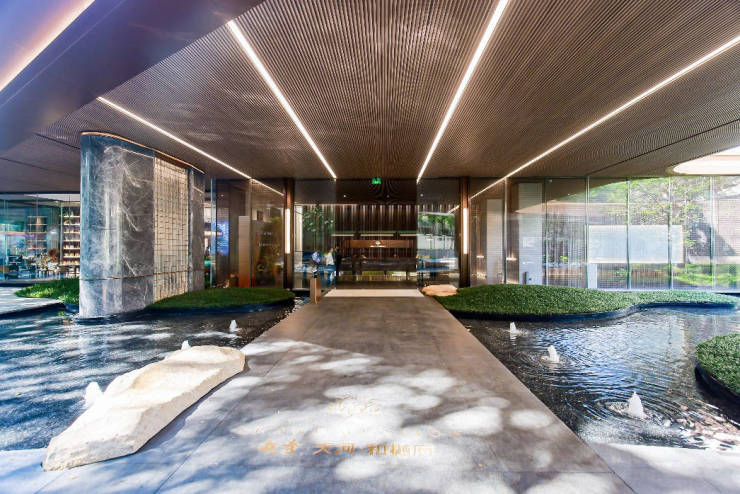 步入山水会客厅内,约4m高差的星级大堂与电梯、地库形成了完美的交流动线,更延续【榕樾生活馆】的意境,在此引入更多阳光,打造一处“蓬莱仙境”式的前场空间。