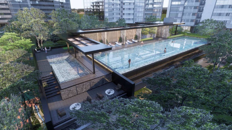 山水会客厅二层,是广州首屈一指的无边界泳池空间,沿用榕樾生活馆的高端石材爱马仕灰石材、复合大理石、花岗岩等优选材质,营造通透感更强的畅游体验,给业主带来诗意般的度假生活感。