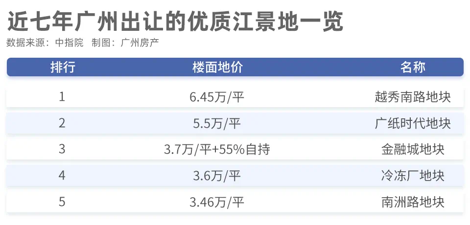 近几年广州出让百余宗商住用地,但中心区一线临江地块,仅区区7宗,且价值不菲,较新拍出的越秀南地块,楼面价6.45万/㎡,打破广州记录。