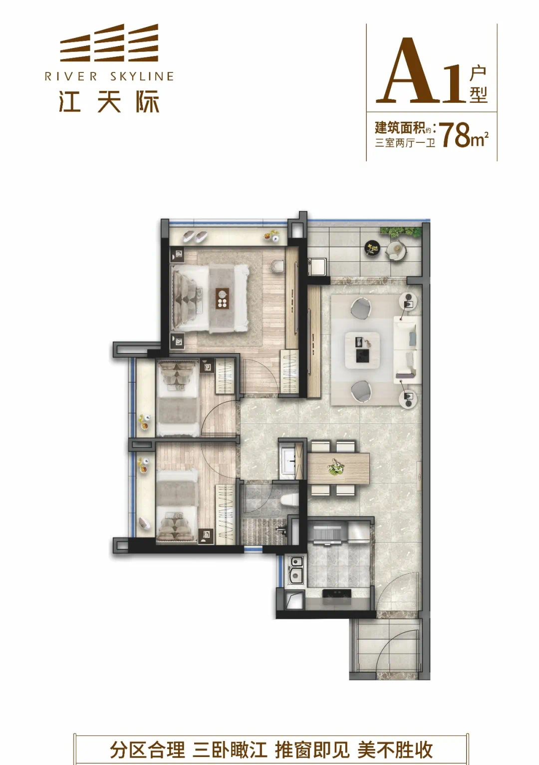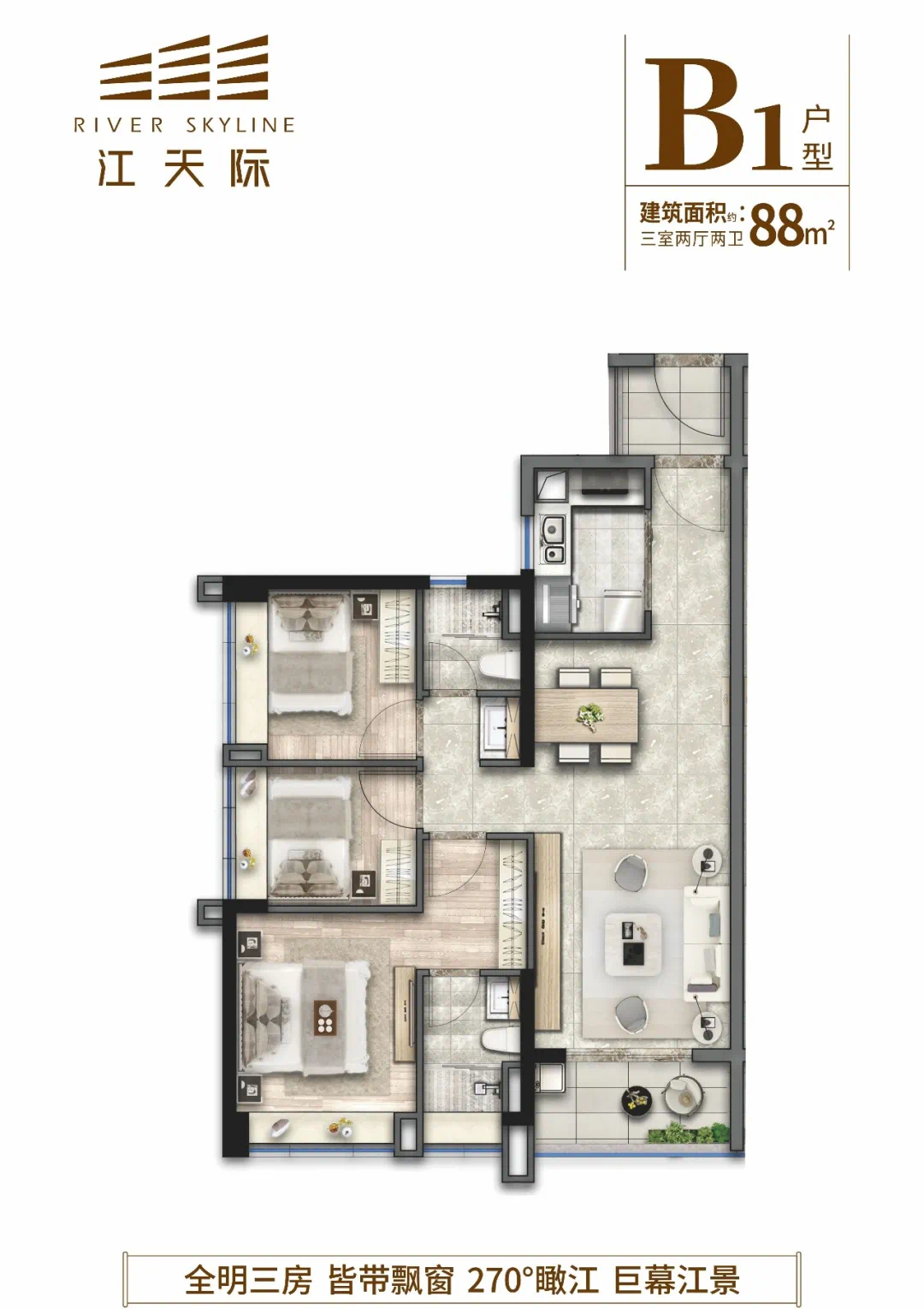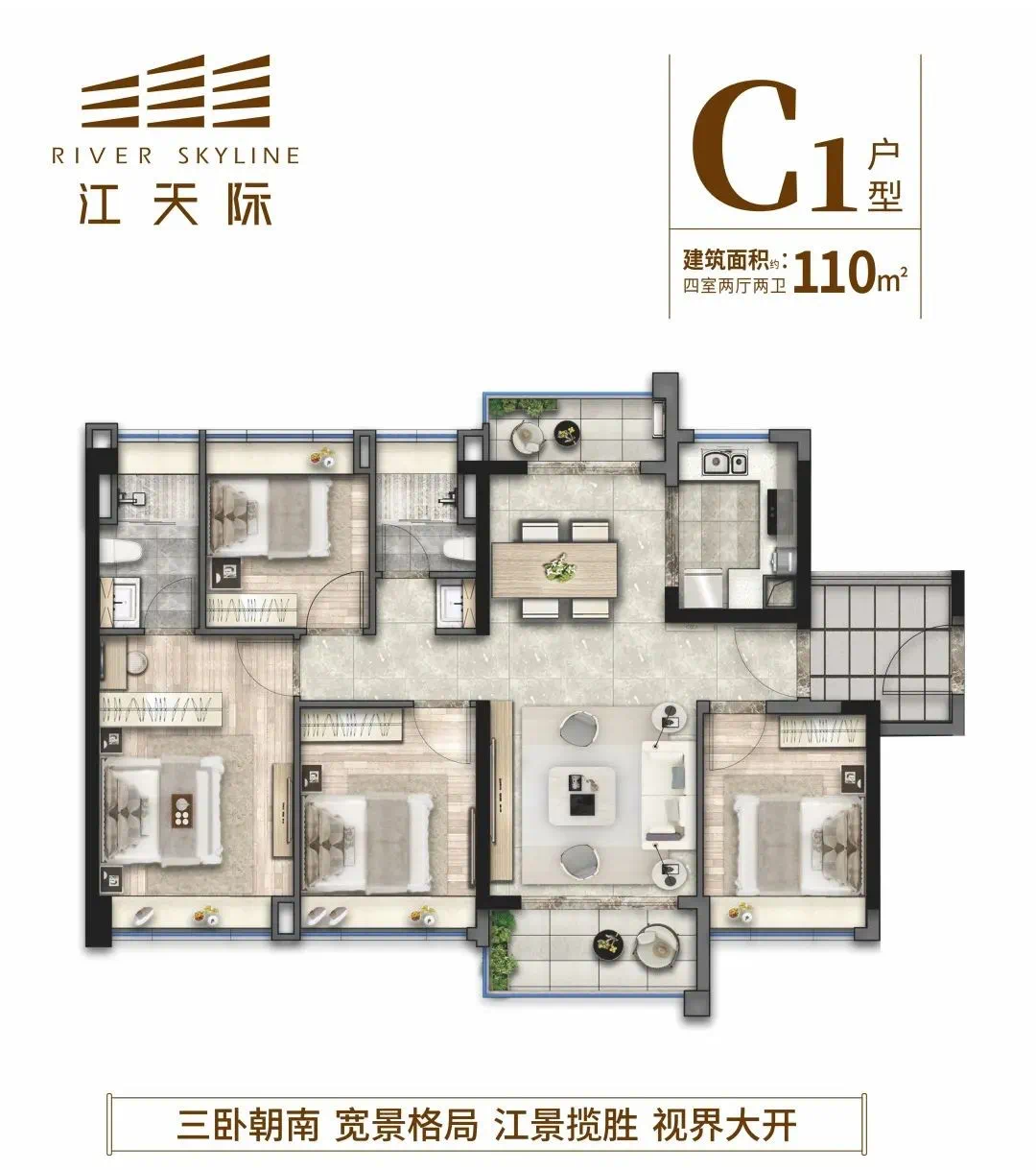 其还有一大诱惑,四面朝南,三面270°环江,直面巨幕江景,体验震撼。
