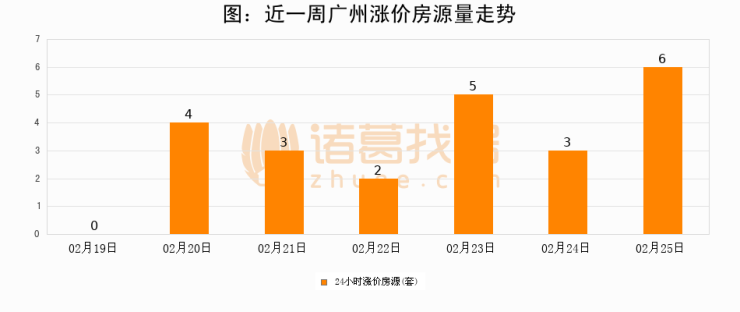 根据诸葛找房数据显示,广州24小时涨价房源量为6套,较02月24日增加3套,环比上涨100%。与此同时,涨价房源占比小幅扩大,业主信心有所提升。
