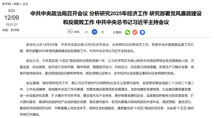 据新华社报道,中共中央政治局12月9日召开会议,分析研究2025年经济工作。