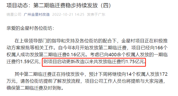 在上级领导部门的指导和支持及各位街坊的配合下,金星村项目正在积极推动方案报批等相关工作。自今年8月开始发放第二期临迁费,项目已经向166个权属人成功发放第二期临迁费0.16亿元。考虑已向400余个权属人发放的一期临迁费约1.59亿元,则项目启动更新改造以来共发放临迁费约1.75亿元。